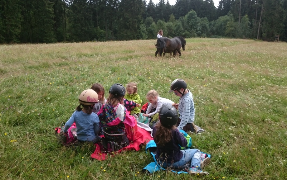 Die Team Pony-Schule Bottenhorn ist eine "elternfreie Zone". Ich werde die Kinder am "Elternparkplatz" abholen und am Kursende als geschlossene Gruppe zurückbringen. Der Abschied fällt den Kindern so in der Regel leichter.